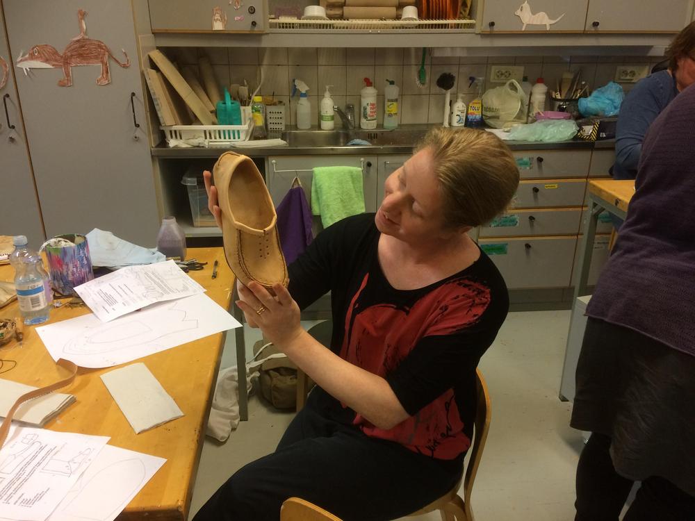 Suutarimestari Ari Tyllin ohjaamalla jalkinekurssilla valmistetaan perinteiset karjalaiset nahkajalkineet käsityönä perinteisin menetelmin.