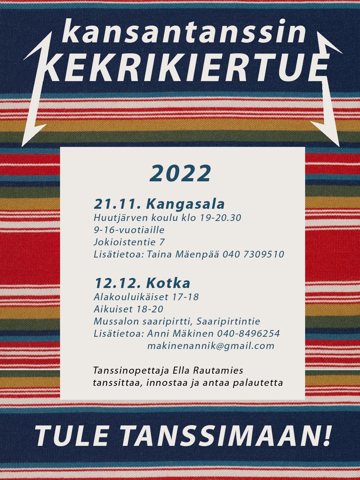 Karjalaisen Nuorisoliiton kekrikiertue saapuu Kangasalle! Tanssinopettaja Ella Rautamiehen johdolla pääset kokeilemaan uusia tanssijuttuja maanantaina 21.11. klo 19–20.30 Huutjärven koululla.